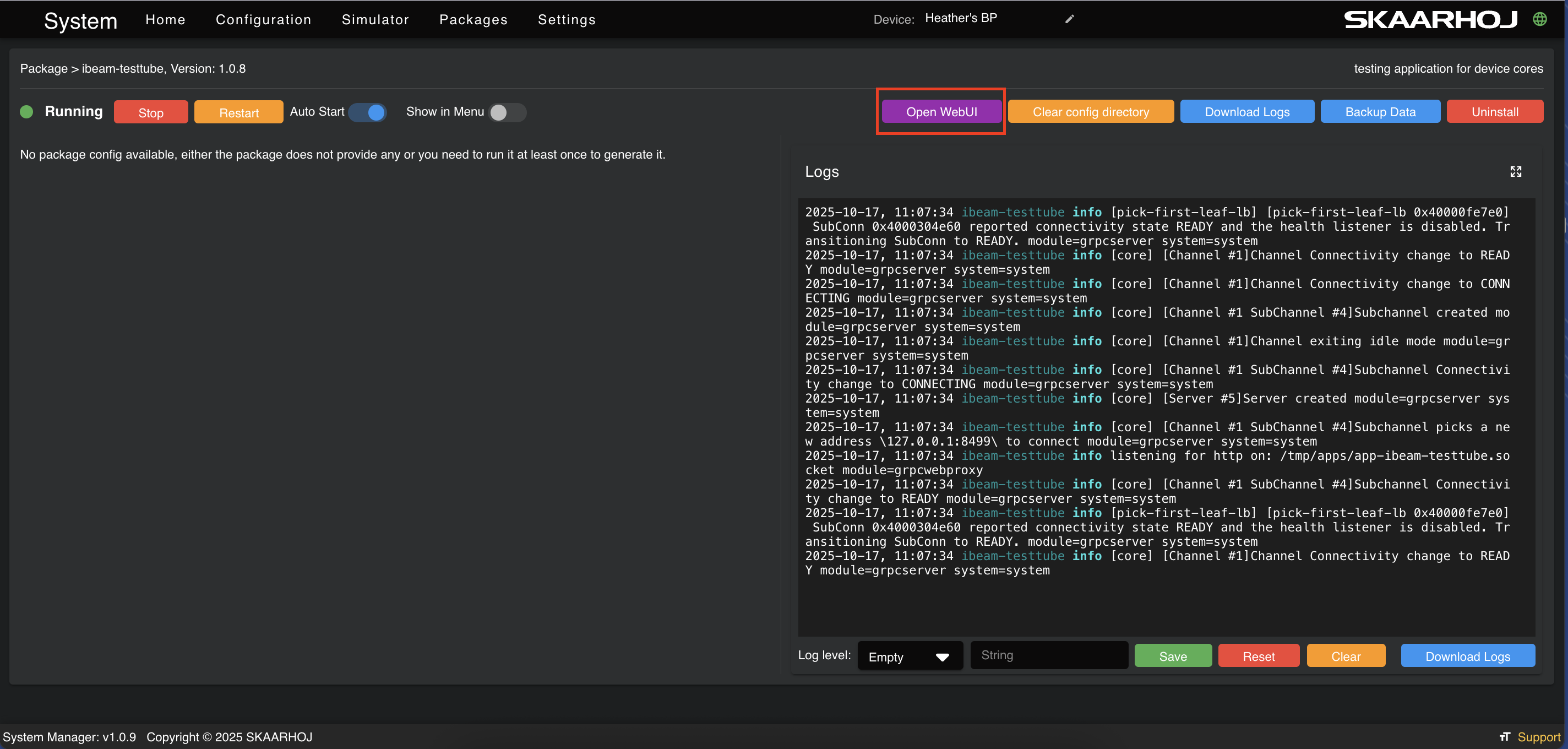 In the WebUI for the Test Tube application click on the Selected Core text to expand the view and see currently running device cores.