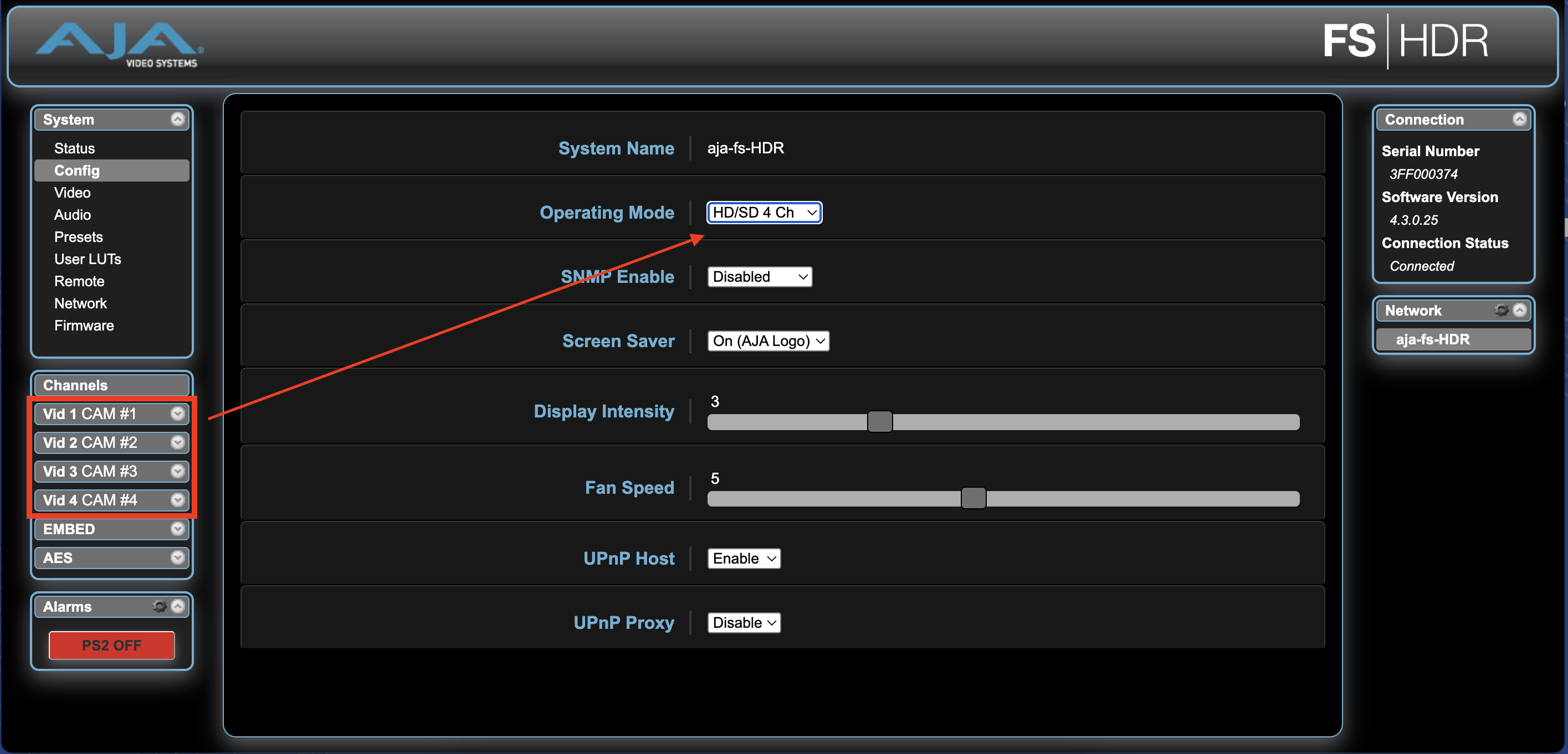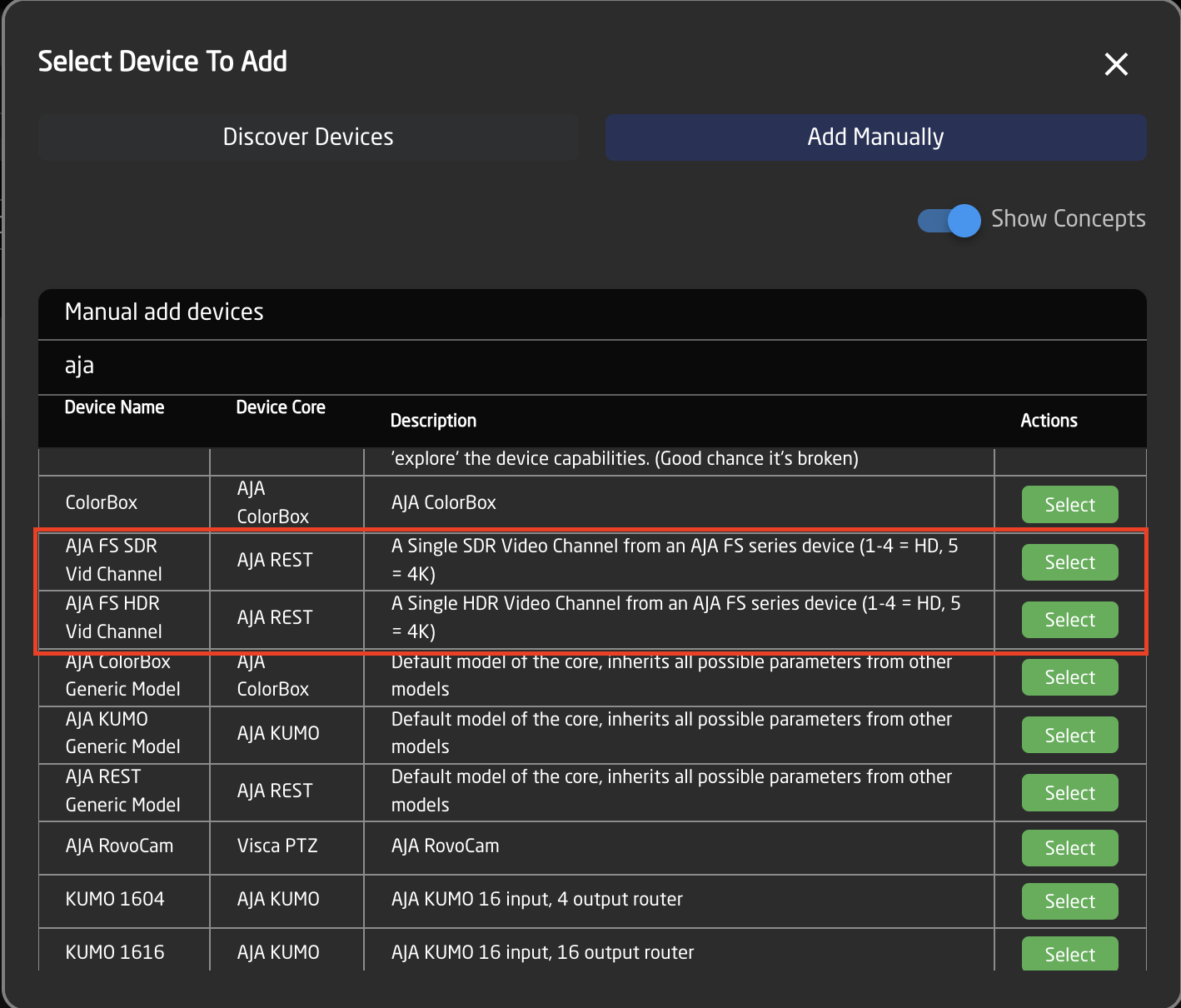 When controlling individual video channels of an AJA FS series frame sync, it is important to add the video channel as an individual device. Selecting AJA FS SDR or AJA FS HDR Vid Channel depending on your FS model.
